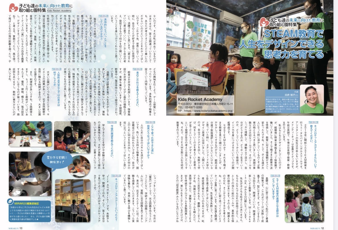 Kids Rocket Academyを紹介いただきました。 保育士雑誌Mirakuにて当園でイケメン俳優1日保育士体験も行いました! KRAの魅力をたくさん掲載していただきました。